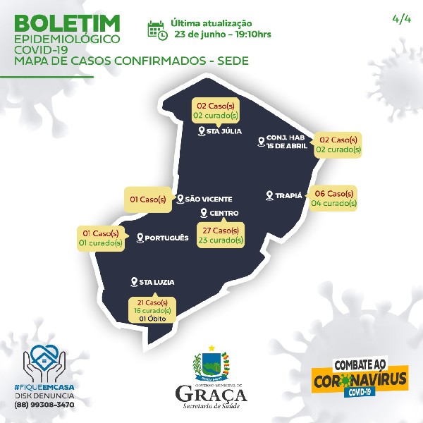 MAPA DE CASOS CONFIRMADOS E CURADOS DO COVID 19 NA SEDE DO MUNICÍPIO - 23/06/2020