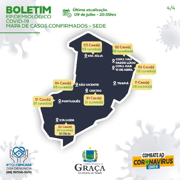 Mapa de casos confirmados e curados do COVID 19 na sede do Município - Atualizado em 09 de julho de 2020.