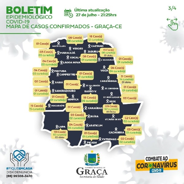 Mapa de Casos Confirmados e curados em todo o município atualizado em 27 de julho de 2020