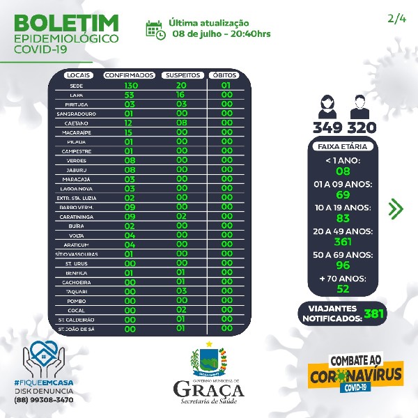 Índice de casos confirmados e suspeitos do COVID 19 por localidade e faixa etária, atualizado em 08 de julho de 2020