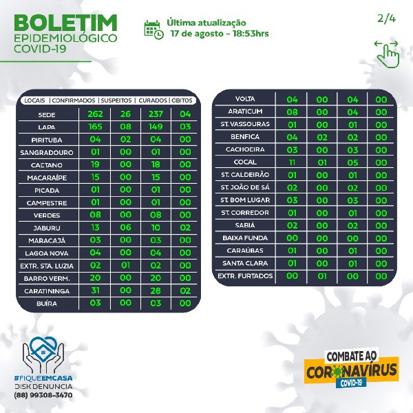 Índice de casos confirmados e suspeitos do COVID 19 por localidade e faixa etária, atualizado em 17 de agosto de 2020